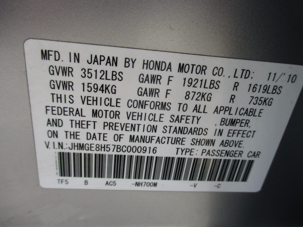 VIN #: | JHMGE8H57BC000916 |